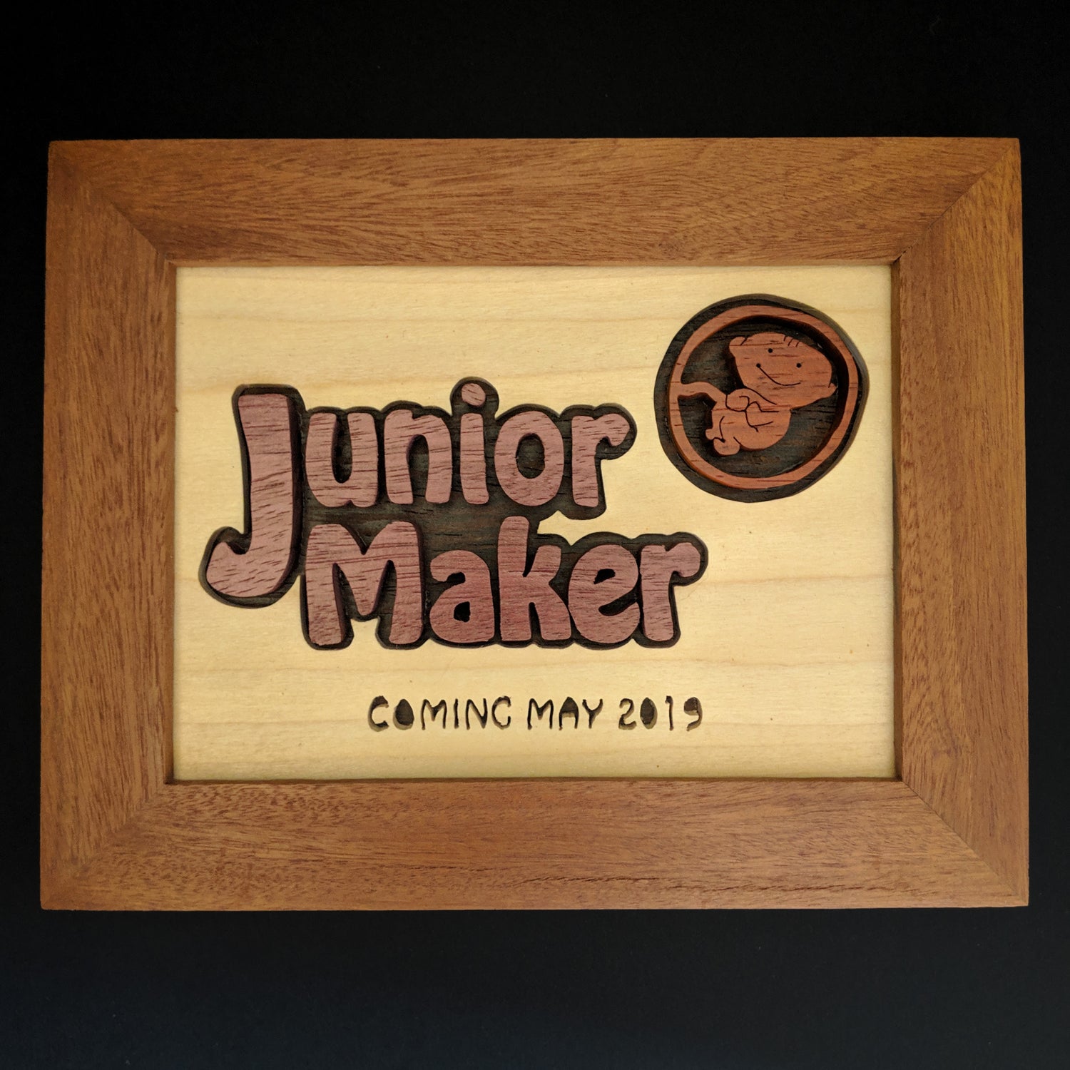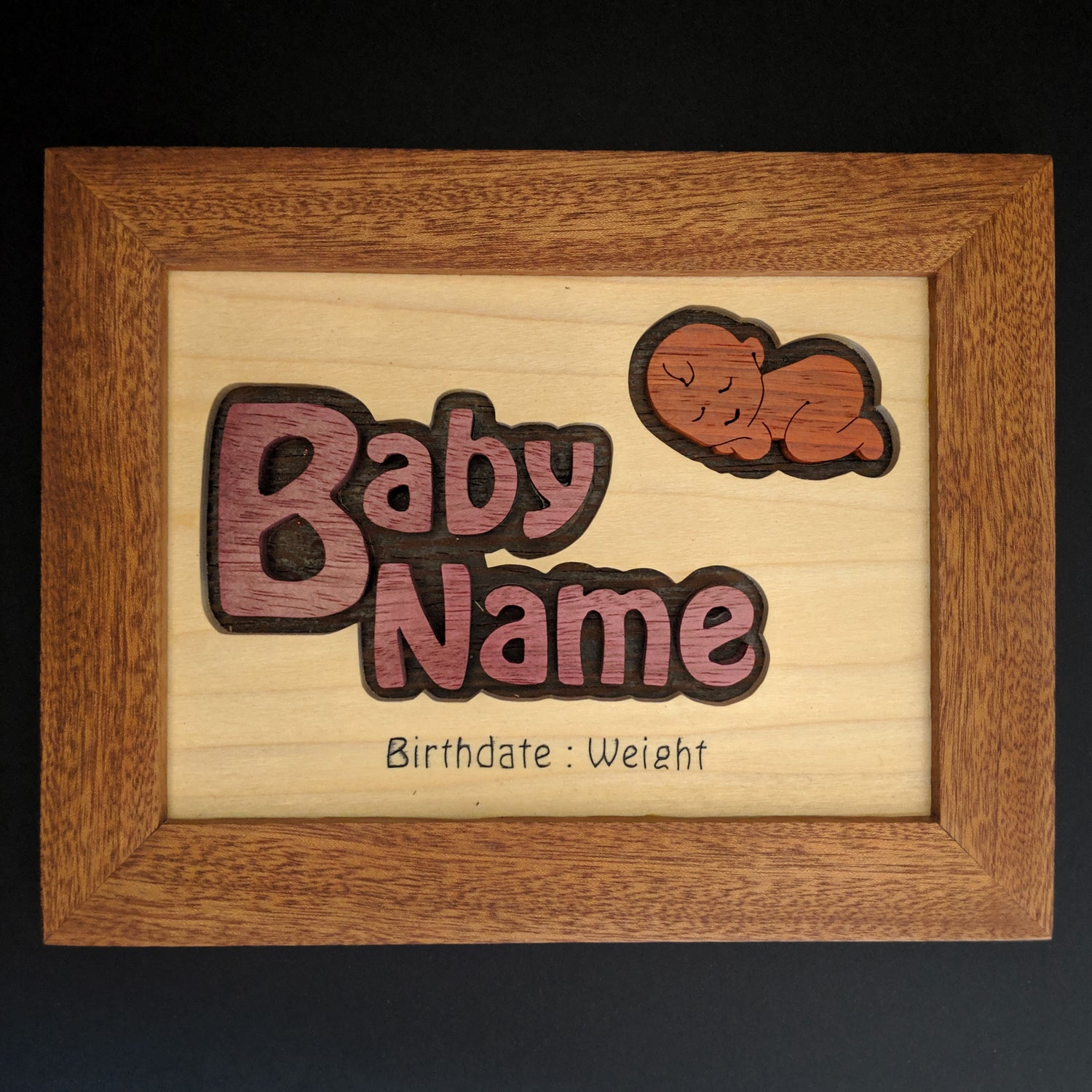 Custom, handmade baby name sign. These signs are custom made to order, using all solid woods of various species. No stain is used. All the colours are the natural wood colour. The sign can include engraved text of birth-date, weight, or other text of your choice.