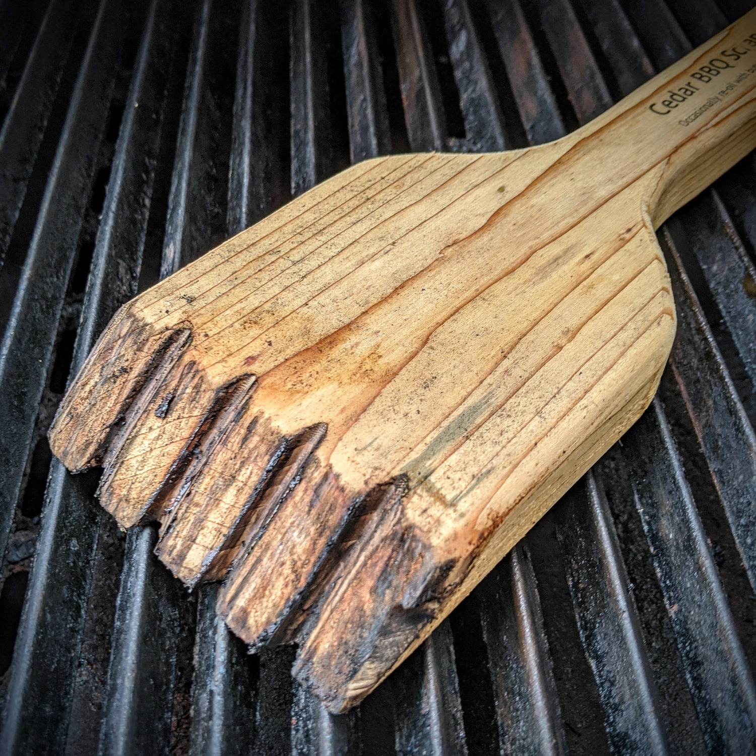 The safer BBQ Scraper. Handmade using Western Red Cedar, finished with food grade mineral oil. These scrapers wear grooves to the the shape of your grill as you use it and will last many years of frequent use. Approx 16" x 4" x 1".
