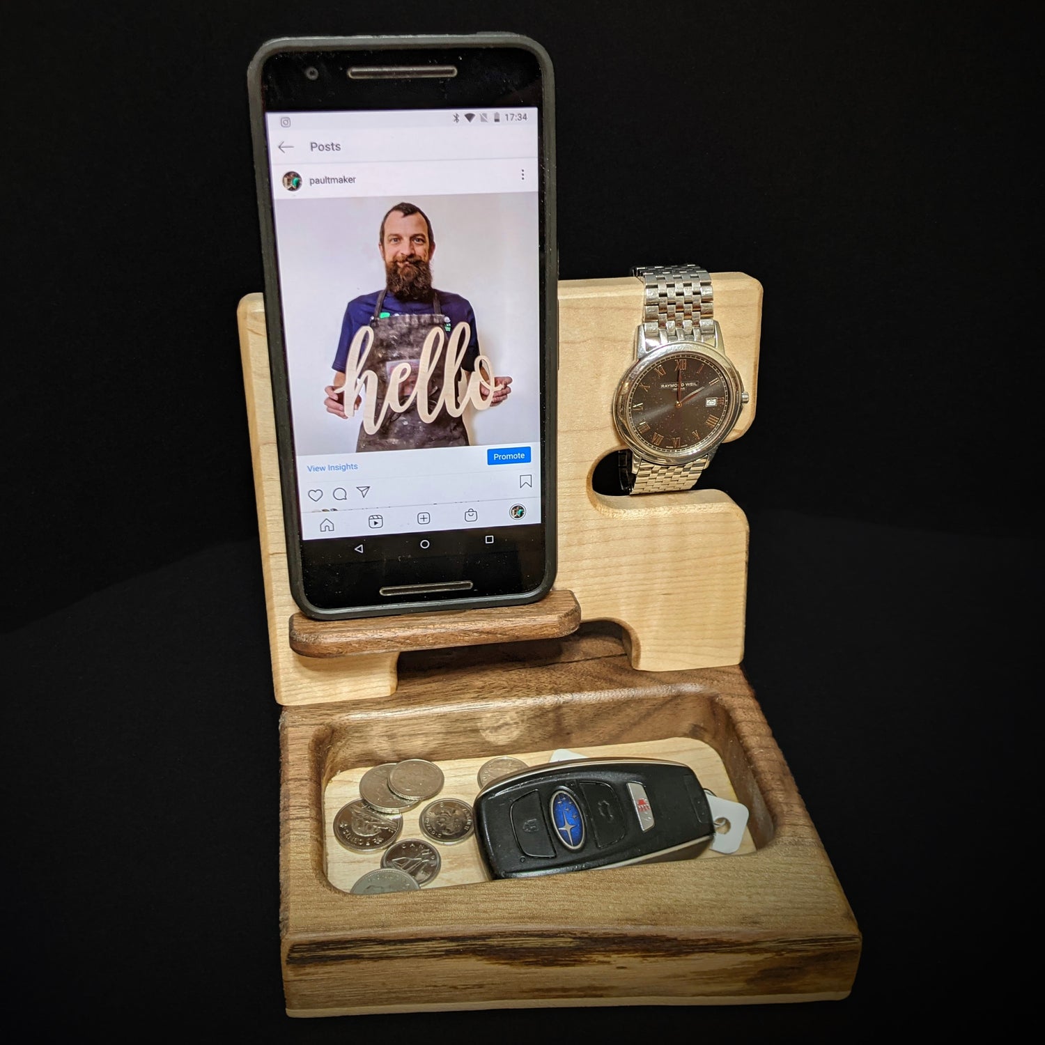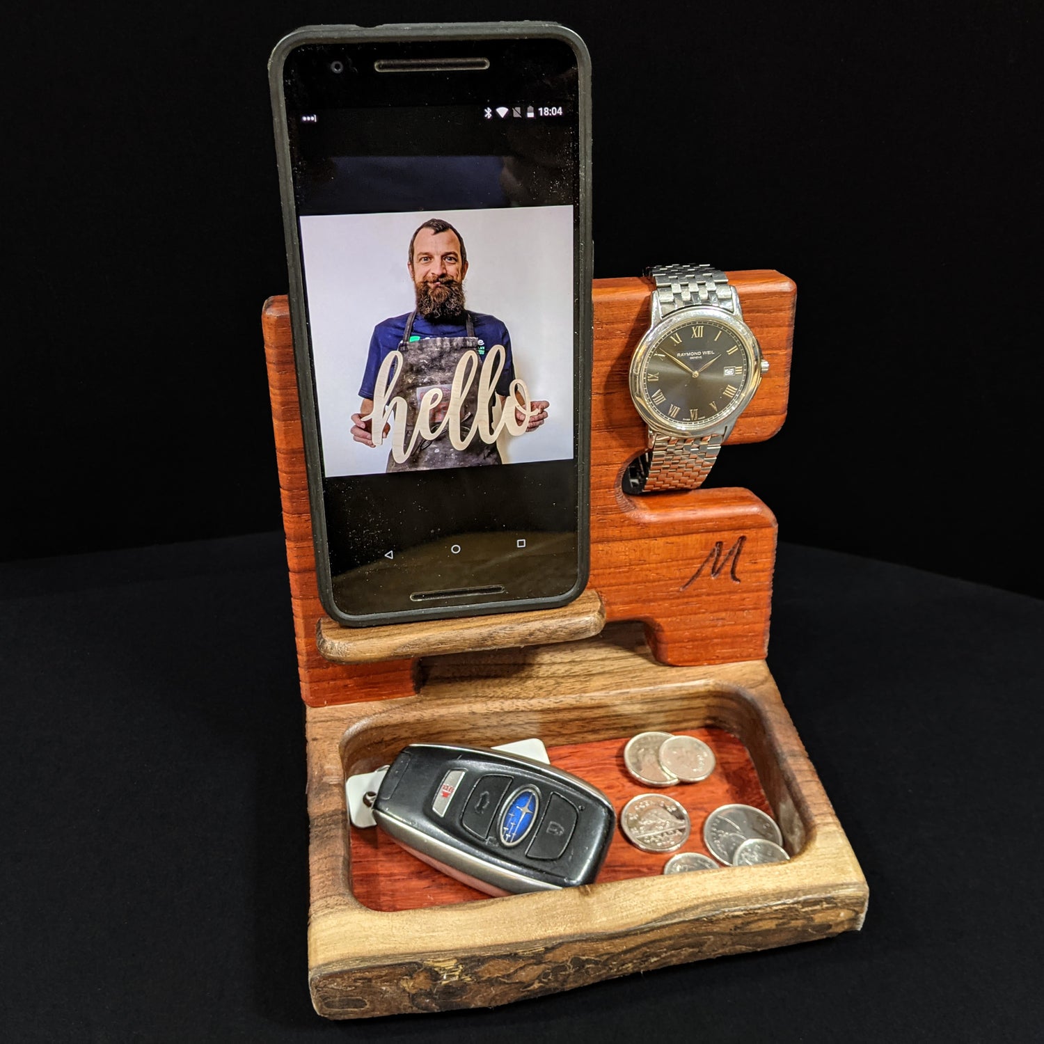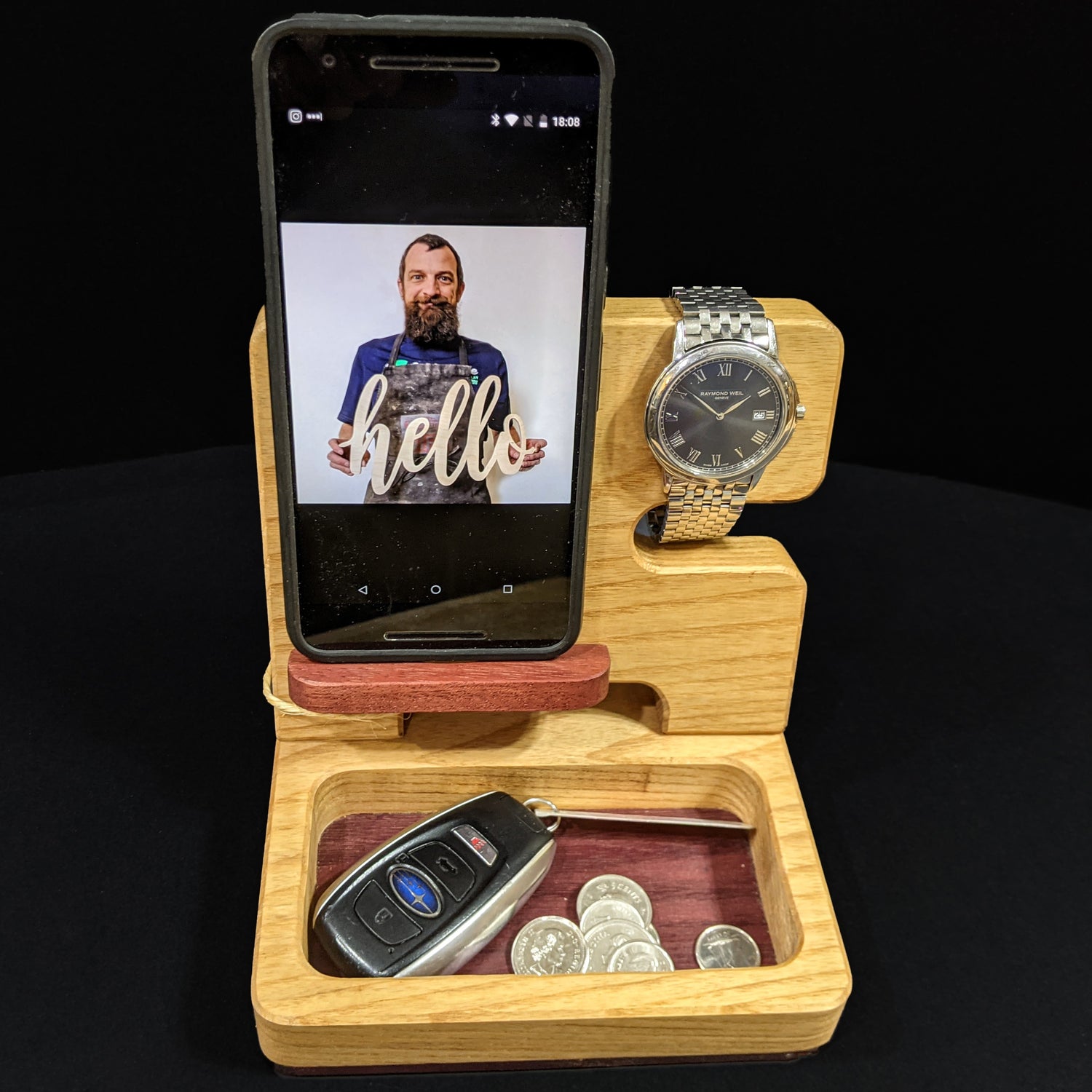 Handmade dresser organizer. Available in various wood species, no stain is used, all the colours are the natural wood colour. Finished with tung oil. Phone stand with cut out for cable, tray for keys or change, and space to hold your watch in style. Can also be v-groove engraved with initials or small design of your choice.
