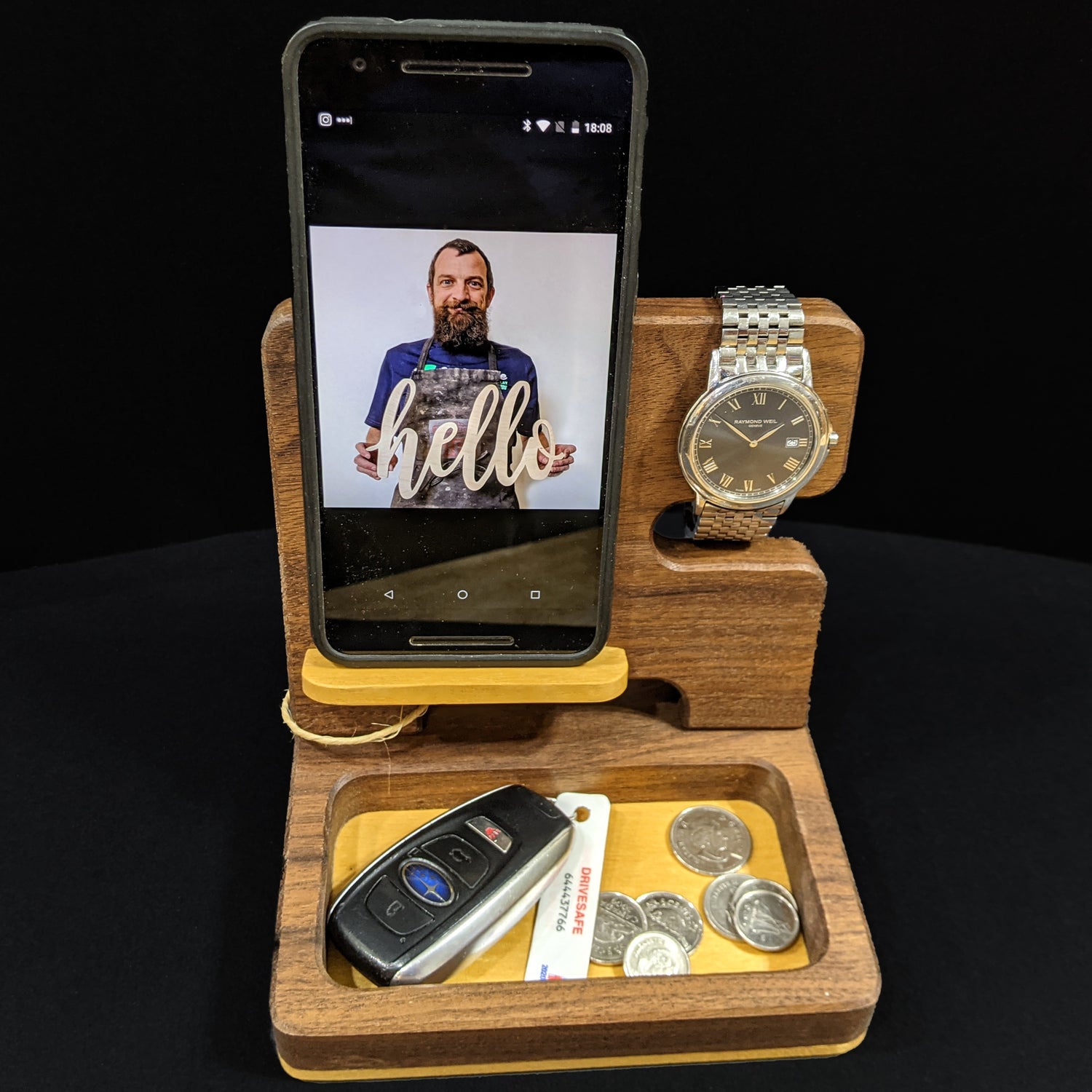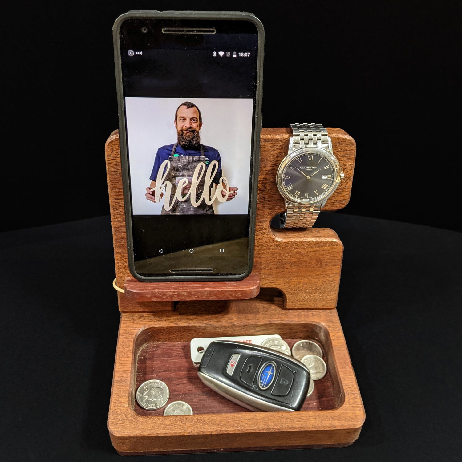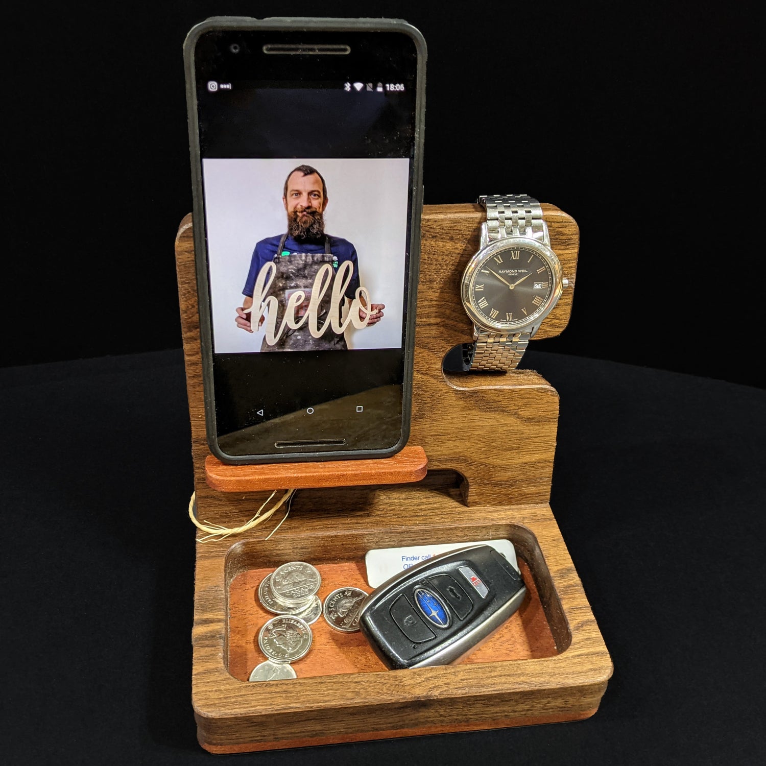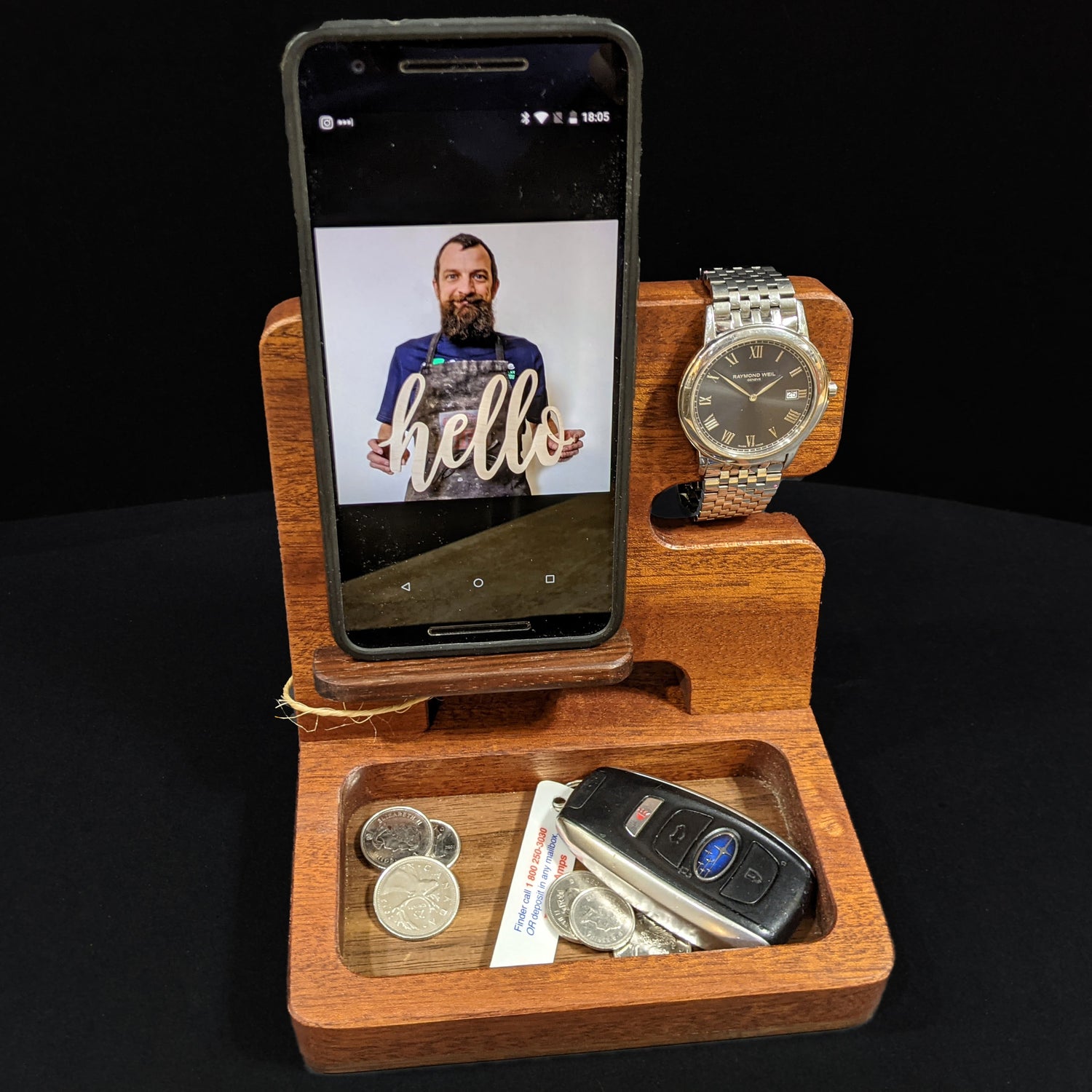 Handmade dresser organizer. Available in various wood species, no stain is used, all the colours are the natural wood colour. Finished with tung oil. Phone stand with cut out for cable, tray for keys or change, and space to hold your watch in style. Can also be v-groove engraved with initials or small design of your choice.