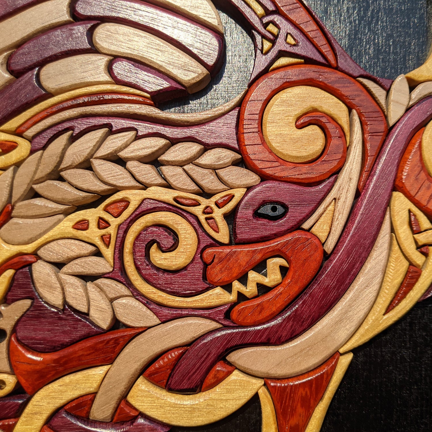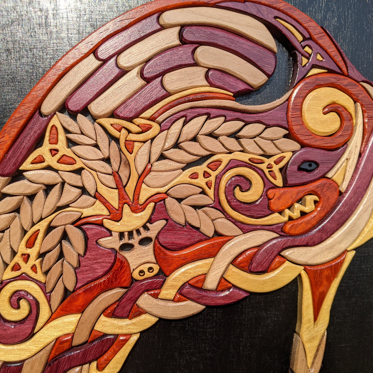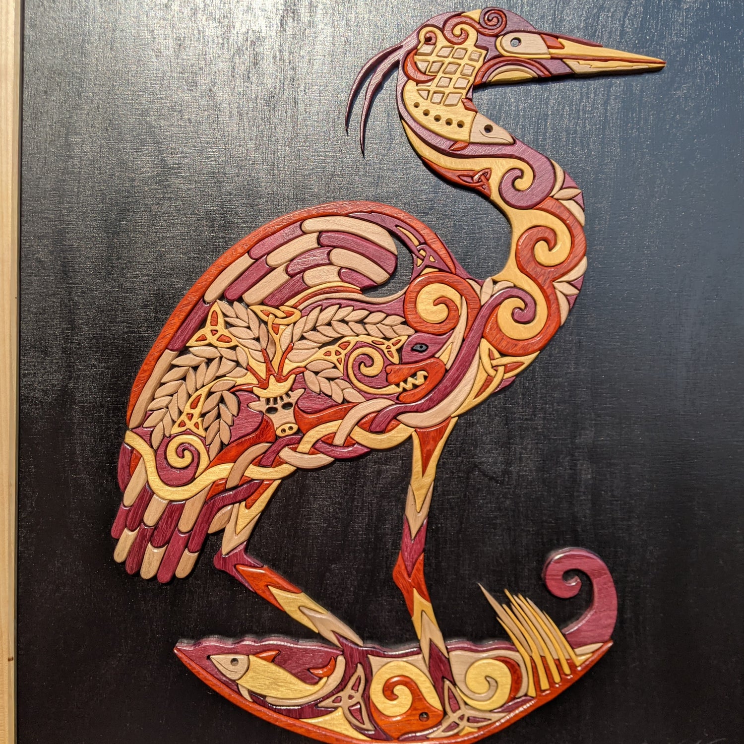 This handmade intarsia 'Huron Heron' artwork is made with various different species of wood, selected for their vibrant natural colours. Each piece of purpleheart, padauk, pau amarello, and walnut is meticulously cut, sanded, and placed. It is based on the Goderich Celtic Roots Virtual Festival 2021 Logo. Original artwork by Linda Wiebe.
