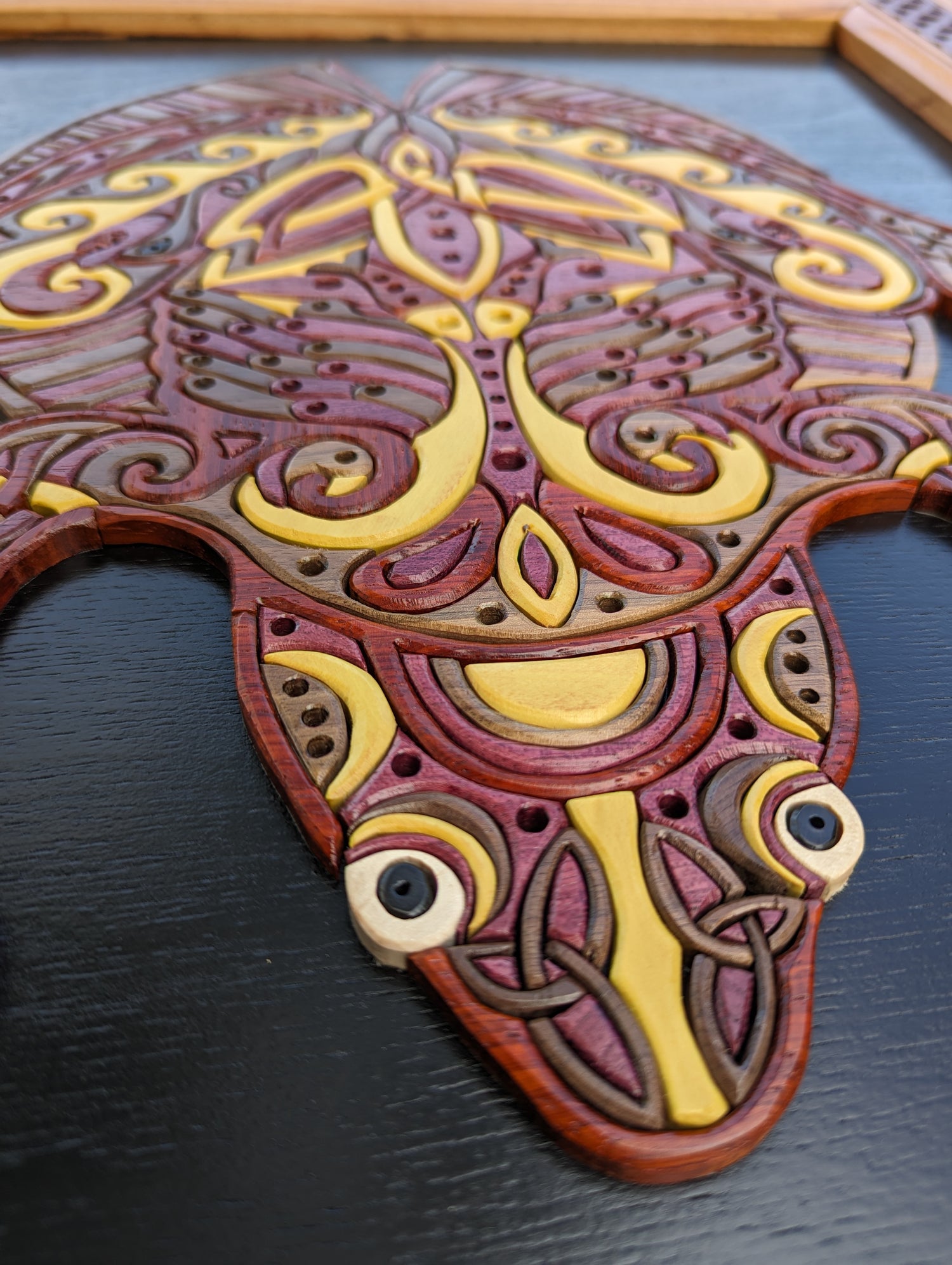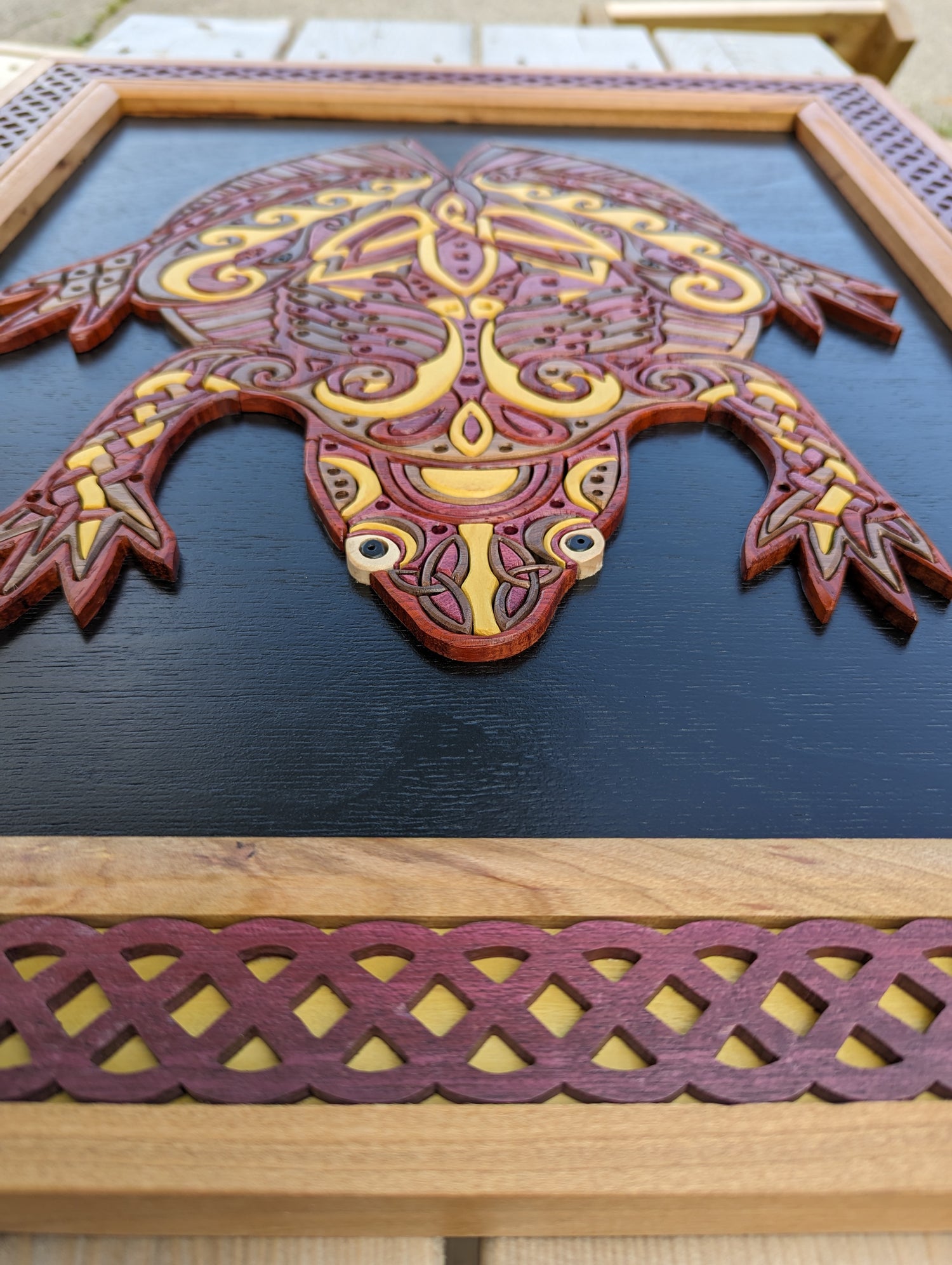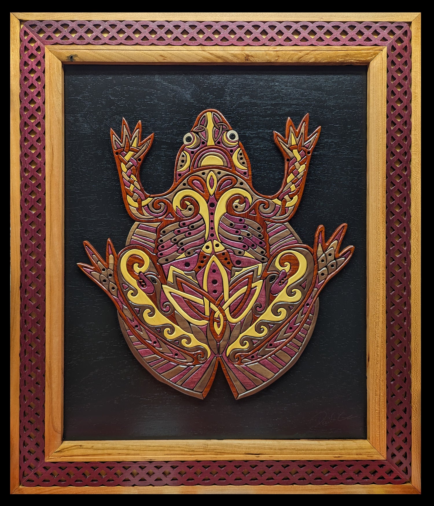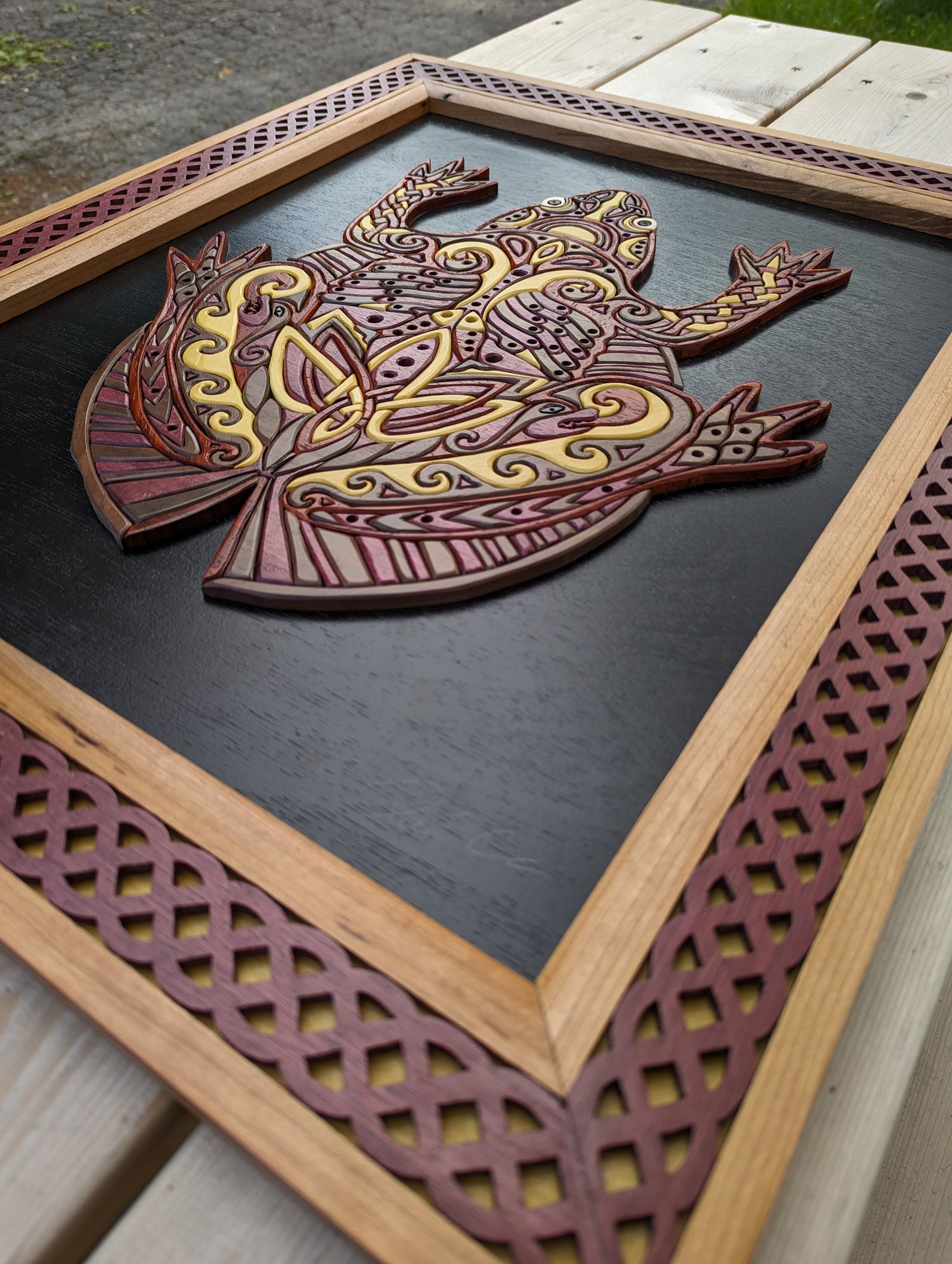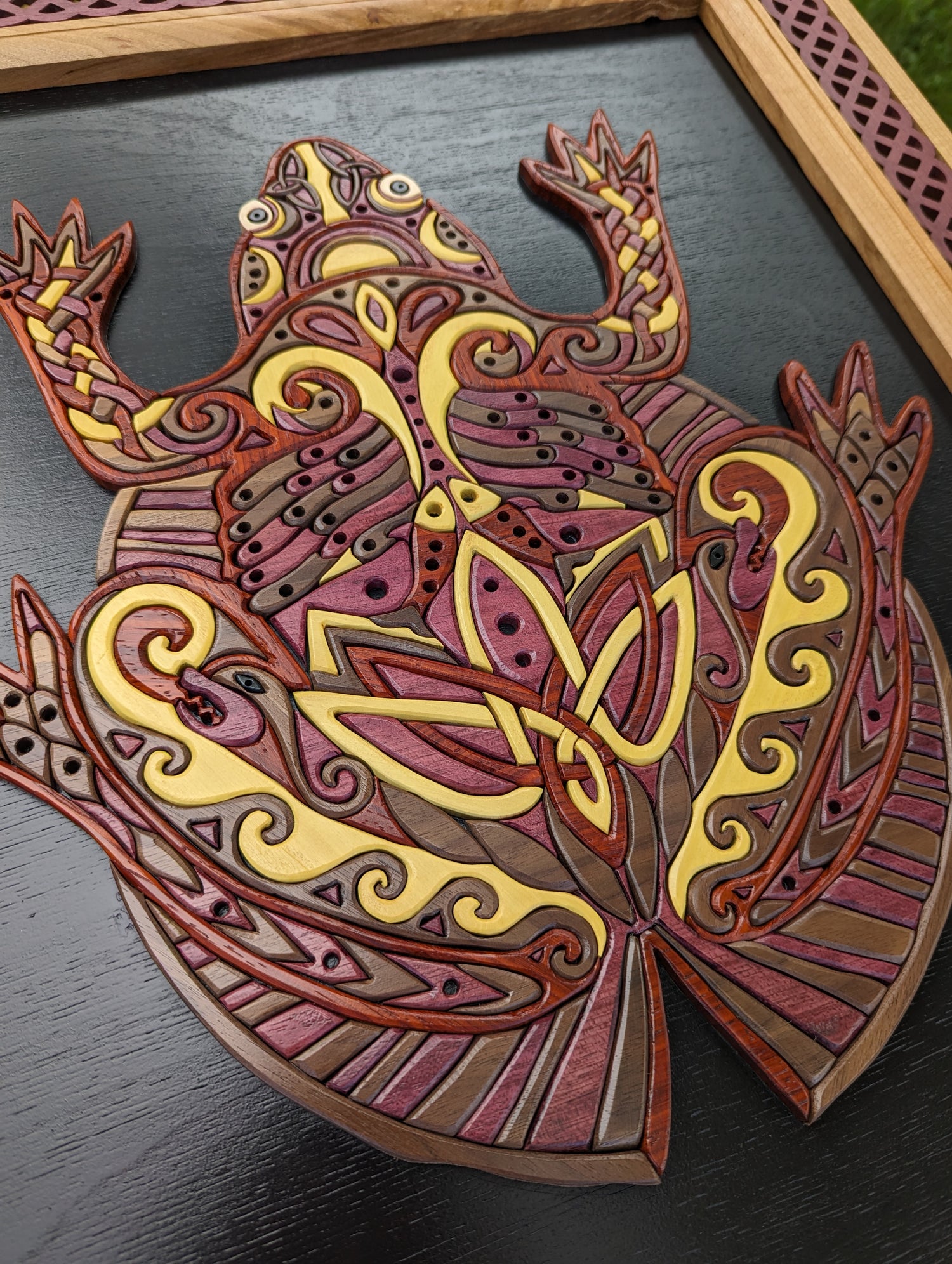 This one-of-a-kind handmade intarsia 'Celtic Frog' artwork is made with various different species of wood, selected for their vibrant natural colours. Each piece of purpleheart, padauk, pau amarello, walnut, maple, and ebony is meticulously hand cut, sanded, and placed. It is based on the Goderich Celtic Roots Festival 2023 Logo. Original artwork by Linda Wiebe.