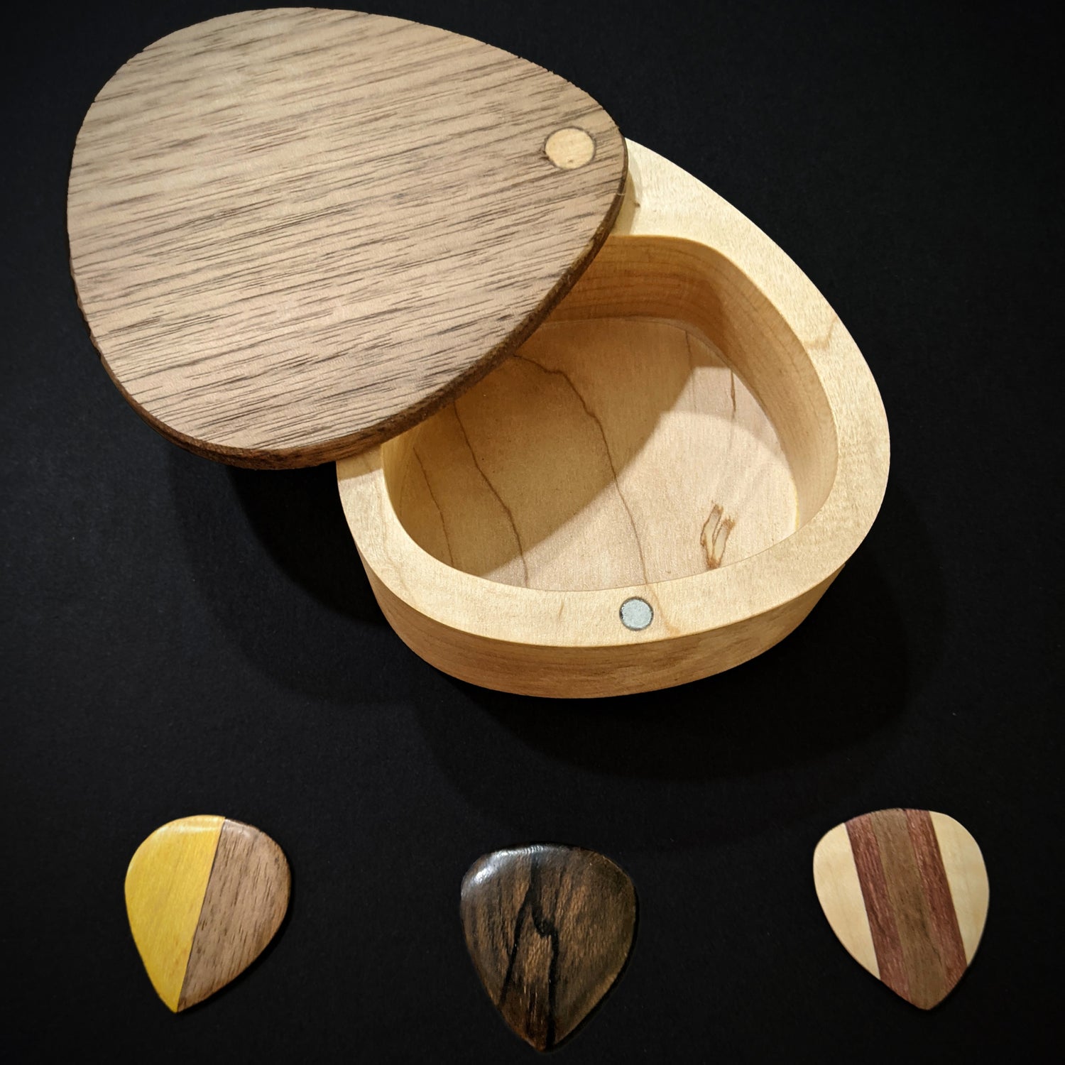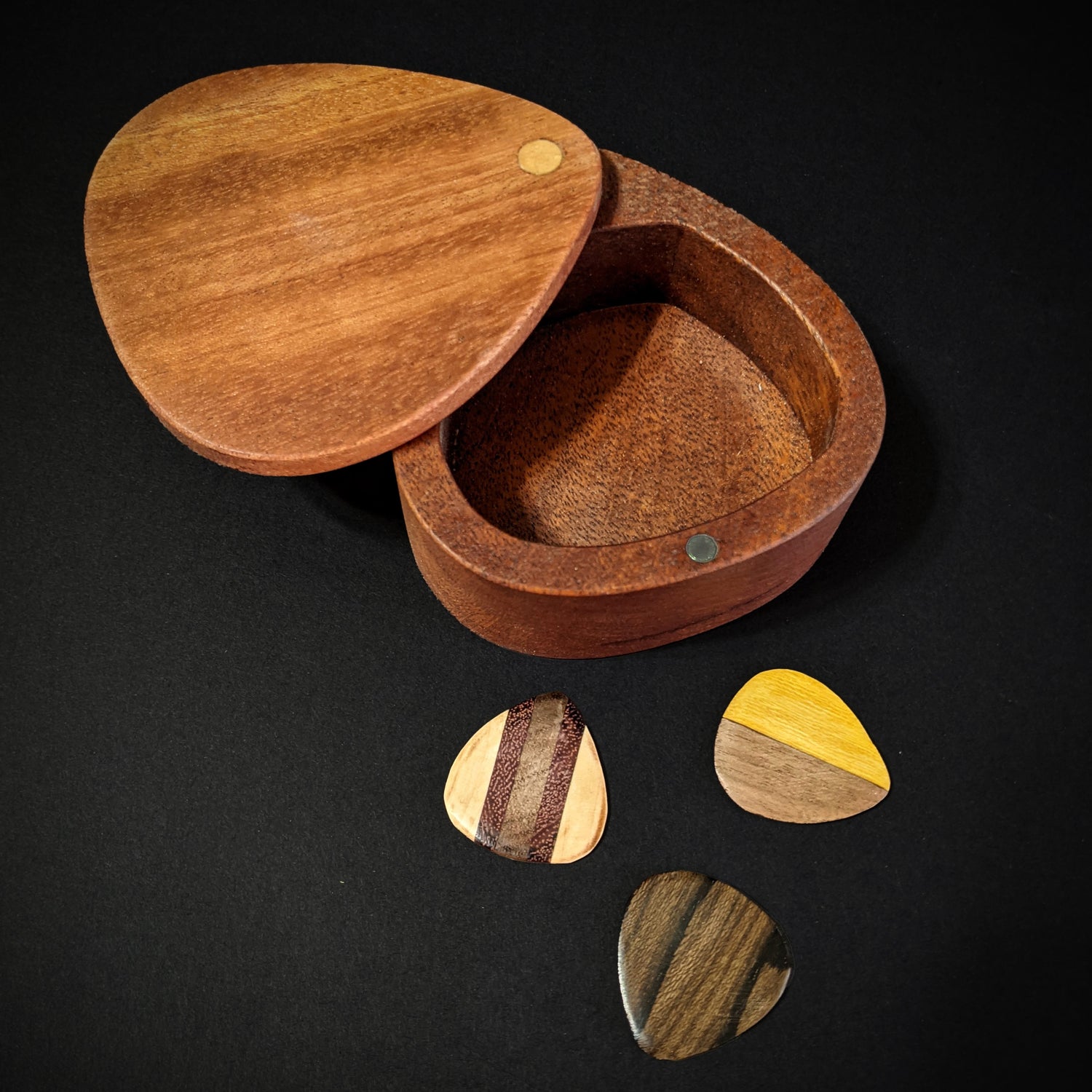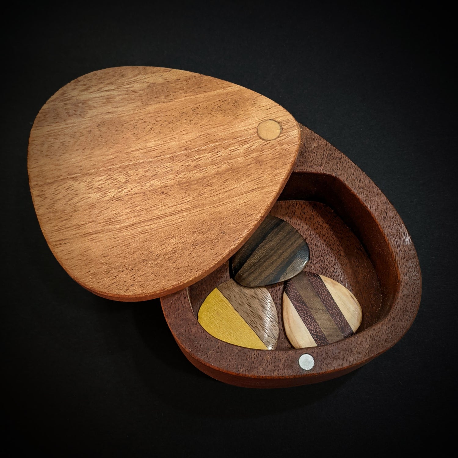 Handmade guitar pick case with rotating lid that snaps into place with mini magnets and three exotic wood picks. Various wood species combinations will be available. Pick selection may not be as shown.