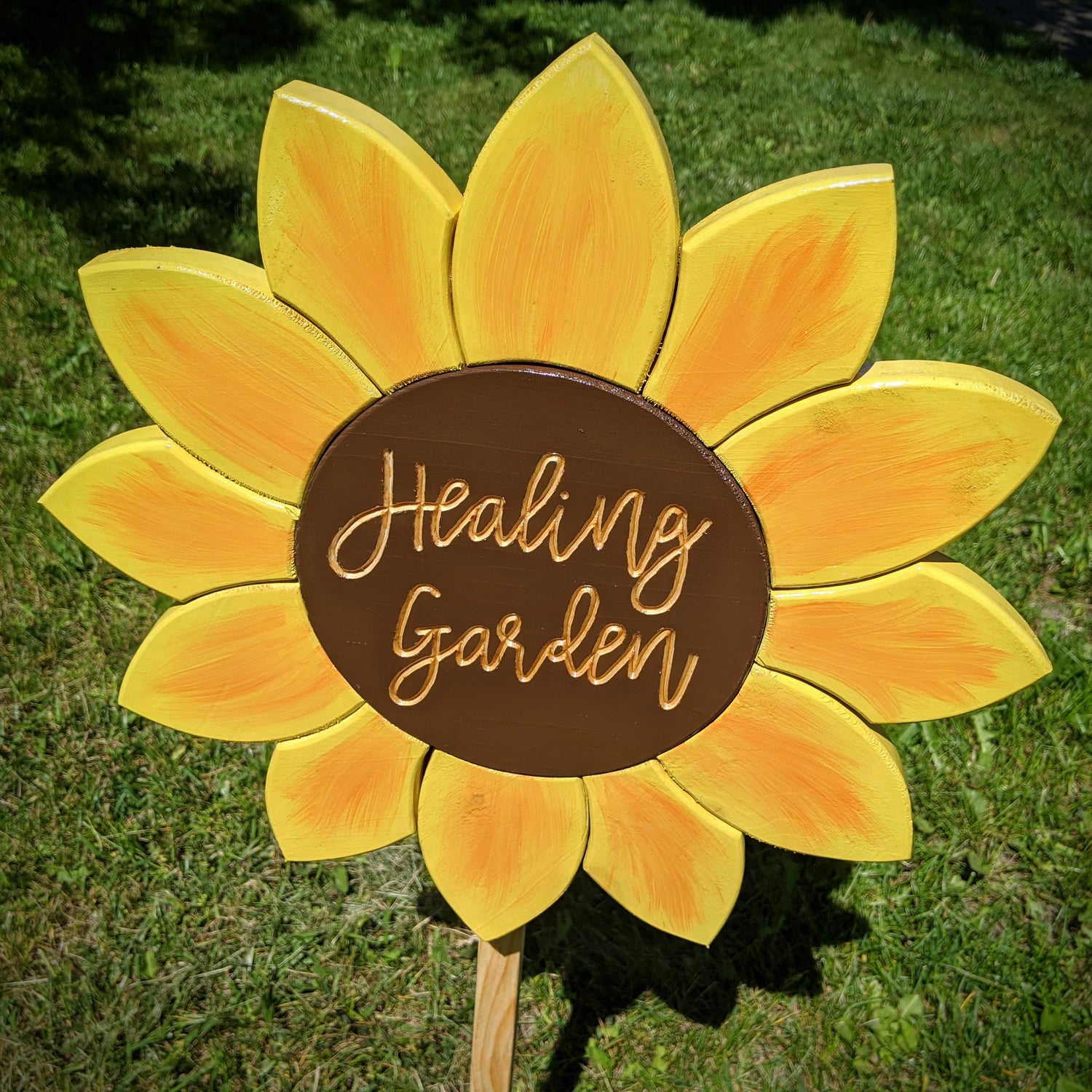 Handmade 'Healing Garden' sign. Reclaimed lumber, hand engraved, painted with Annie Sloan Chalk paint, finished with polyurethane. 14" across, includes ground stake.