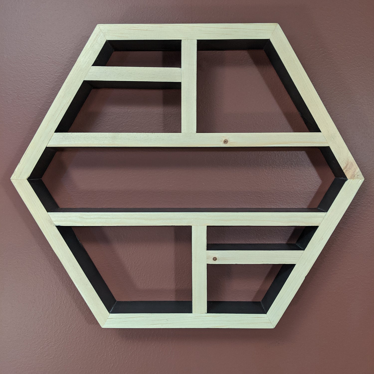 Hexagon shaped essential oil shelf. Handmade with solid pine, painted with Annie Sloan chalk paint, and finished with polyurethane. Approx 20" x 17" x 2".