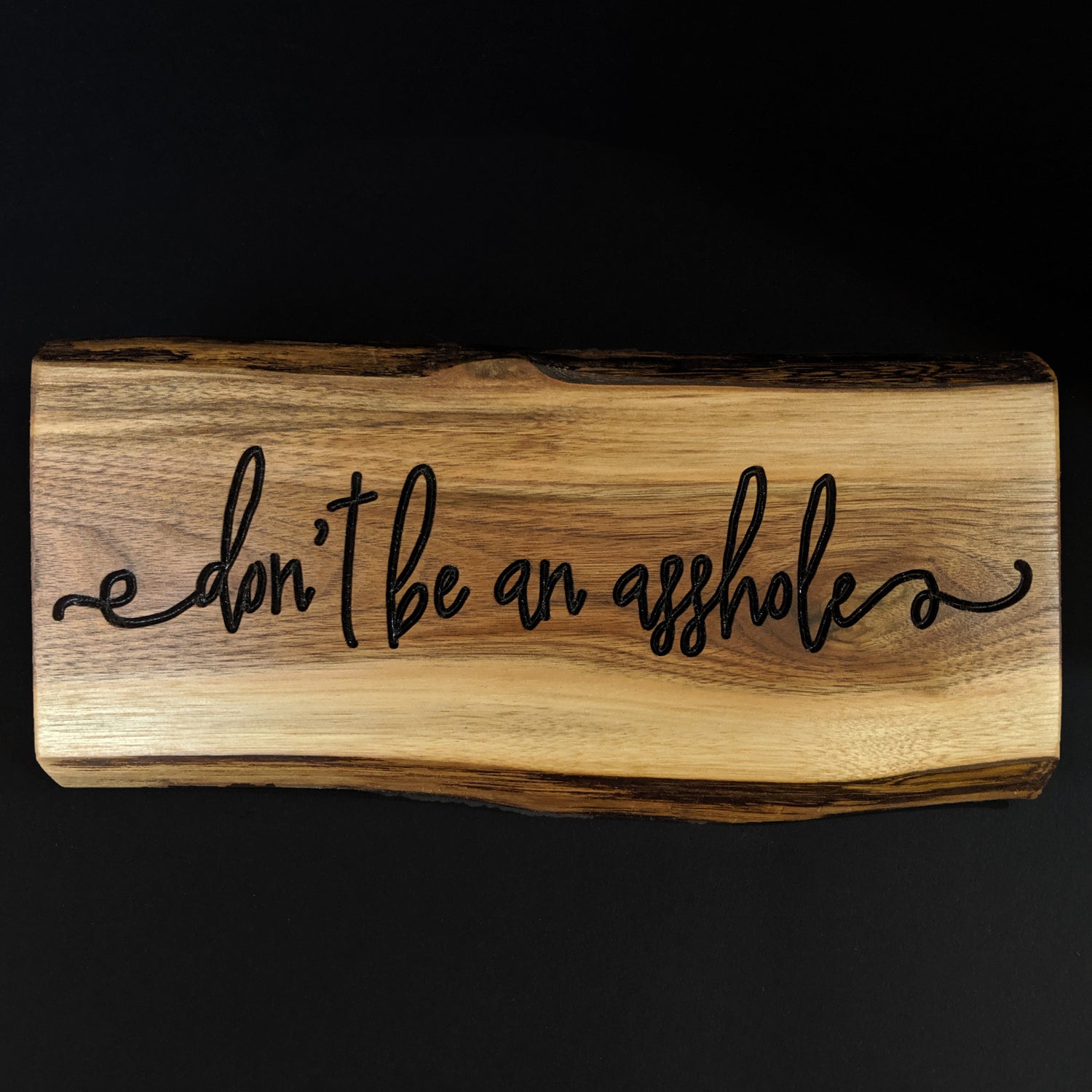 Handmade live edge walnut sign. The design is engraved by hand, painted, and the sign is finished with tung oil.