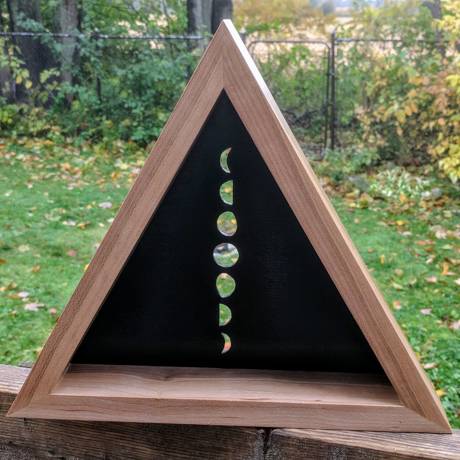 Handmade Moon Phase shelf. Made with solid cherry with a high quality Baltic Birch plywood backing. 12" across.