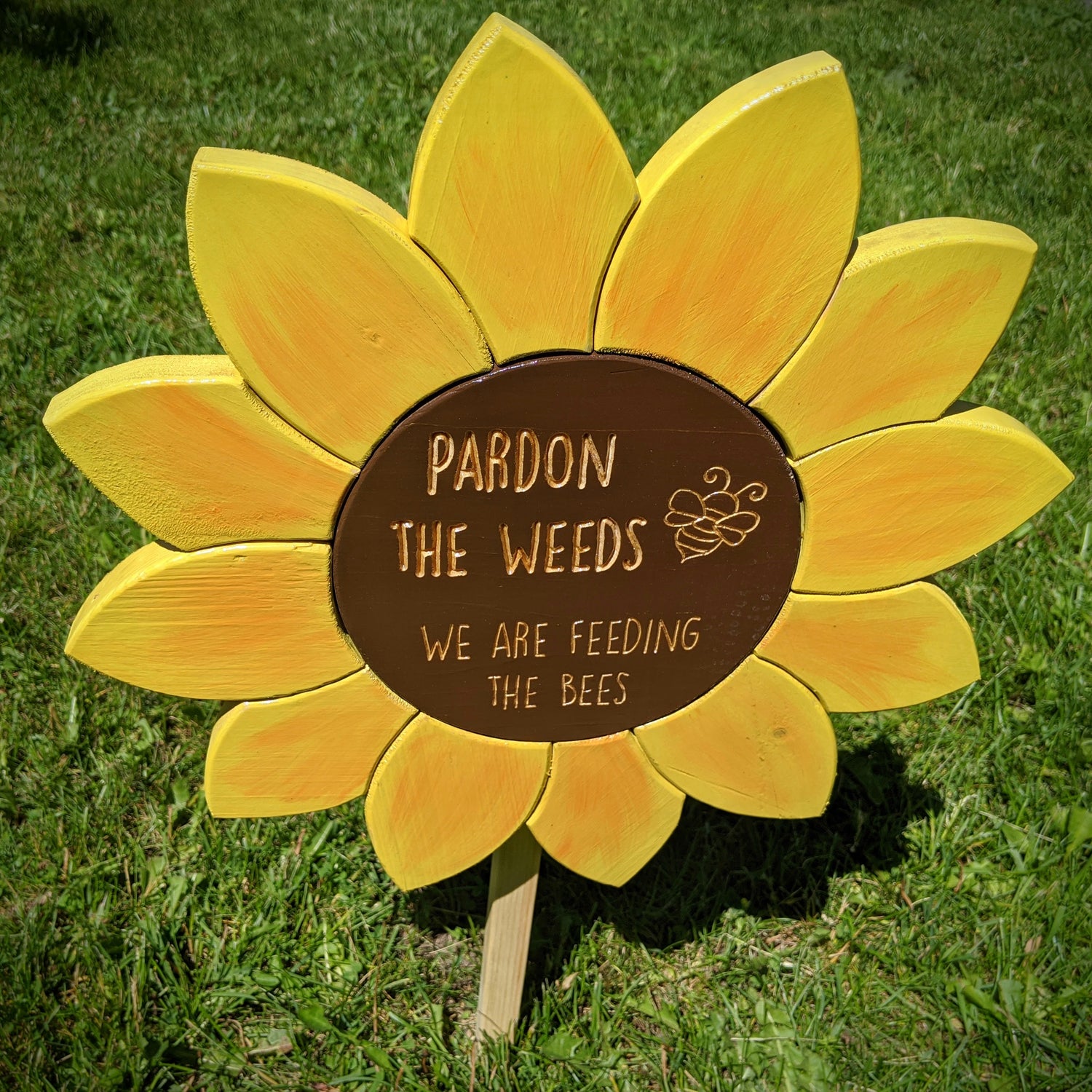 Handmade 'Pardon the weeds, we are feeding the bees' sign. Reclaimed lumber, hand engraved, painted with Annie Sloan Chalk paint, finished with polyurethane. 14" across, includes ground stake.
