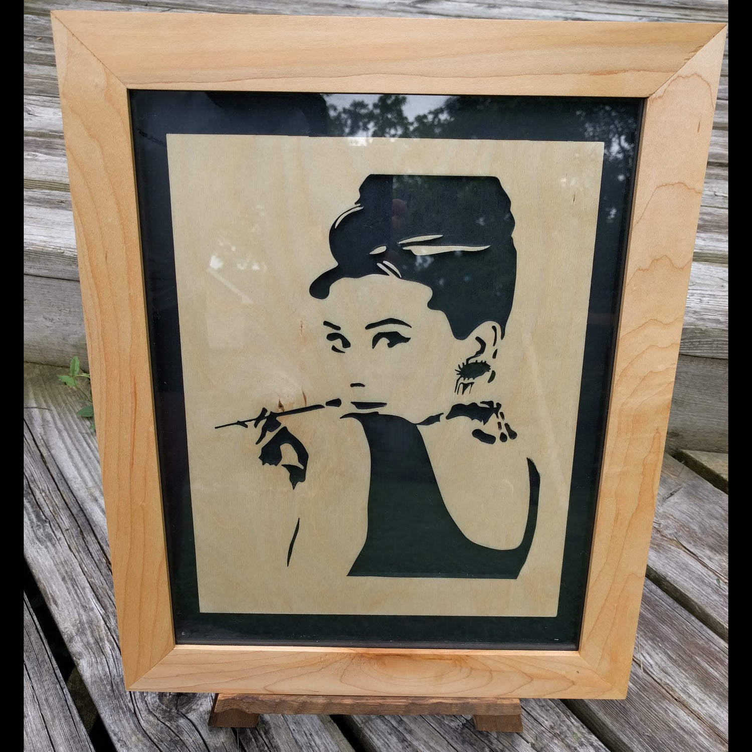 Scrollsaw artwork of Audrey Hepburn in Baltic Birch. Custom handmade frame using reclaimed wood. 11" x 14". Custom work available. Contact me with your idea.